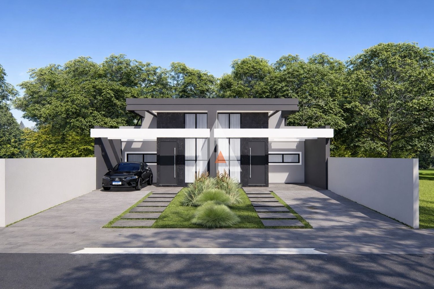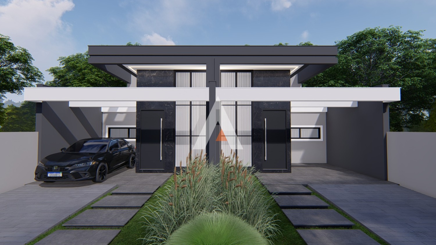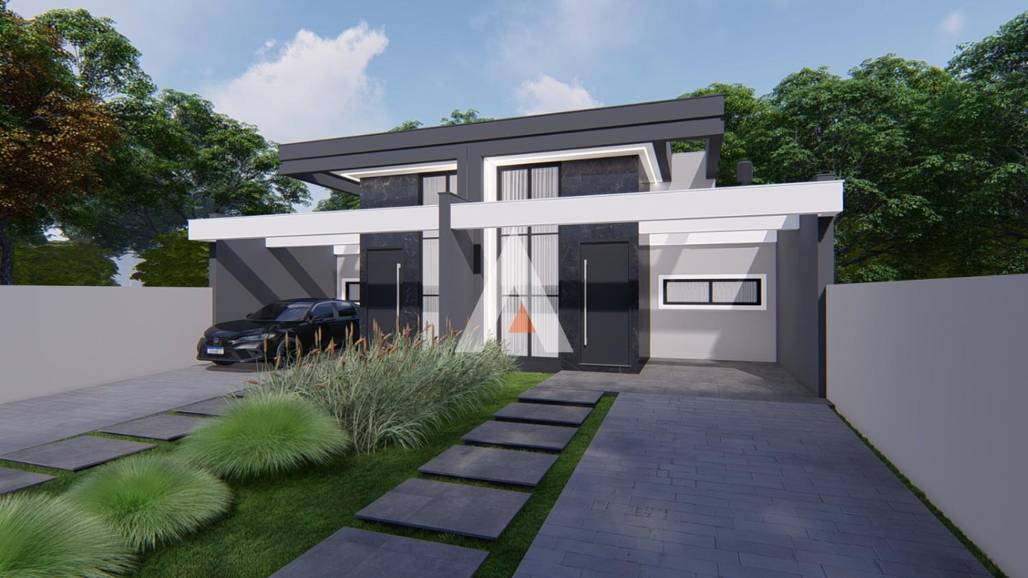 ● Trilhos: Concreto na rampa para o carro e pisantes até a entrada.
