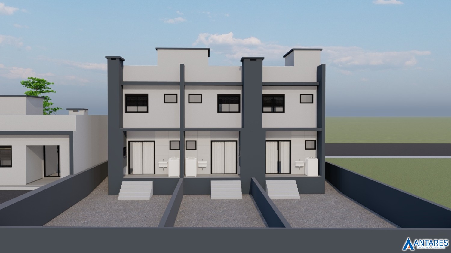 Características: Aberturas externas em alumínio na cor preta, aberturas internas revestidas em pvc na cor branca, piso e rodapés em porcelanato, massa corrida nas paredes internas, roda forro em gesso em todos os cômodos, rebaixo em gesso em partes da sala e cozinha, pátio com grama na parte da frente e brita na parte dos fundos, corrimão e guarda corpo em inox.